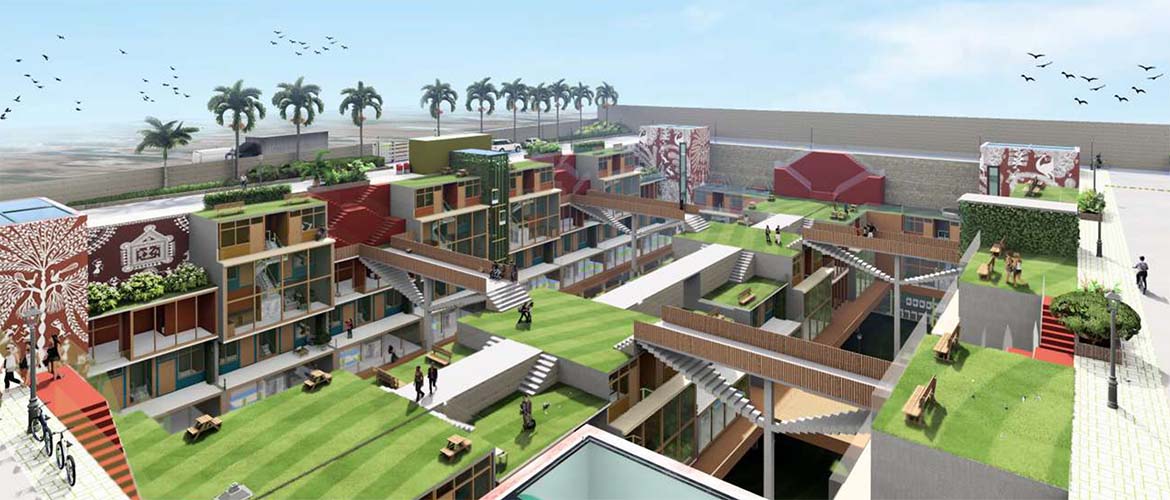A 12-storey office building in the heart of the business district in Baroda. We are in the process of developing planter beds that will protect the glazing and the interior from solar ingress. An art lover, our esteemed client has included a 70'x20' mural on the road facing wall.