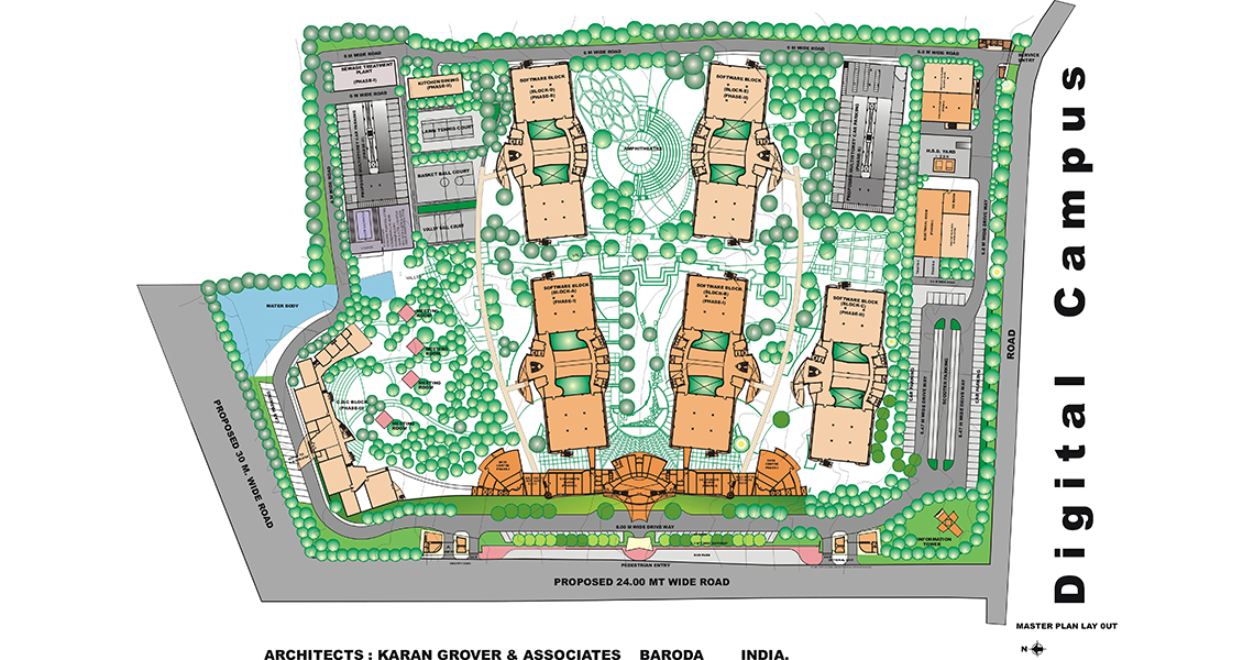 The approach called for cognizing a new typology, which has emerged internationally through globalization & information technology growth. While making a Campus the need was for siting the project within the conceptual, functional and aesthetic framework of international & global corporate ethos with a very contemporary design agenda. This idea had to be simultaneously be woven with the local and contextual reality, symbolism & materials of construction.