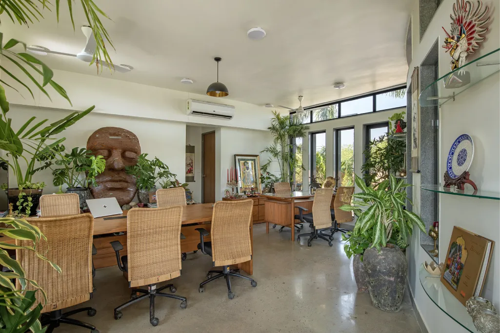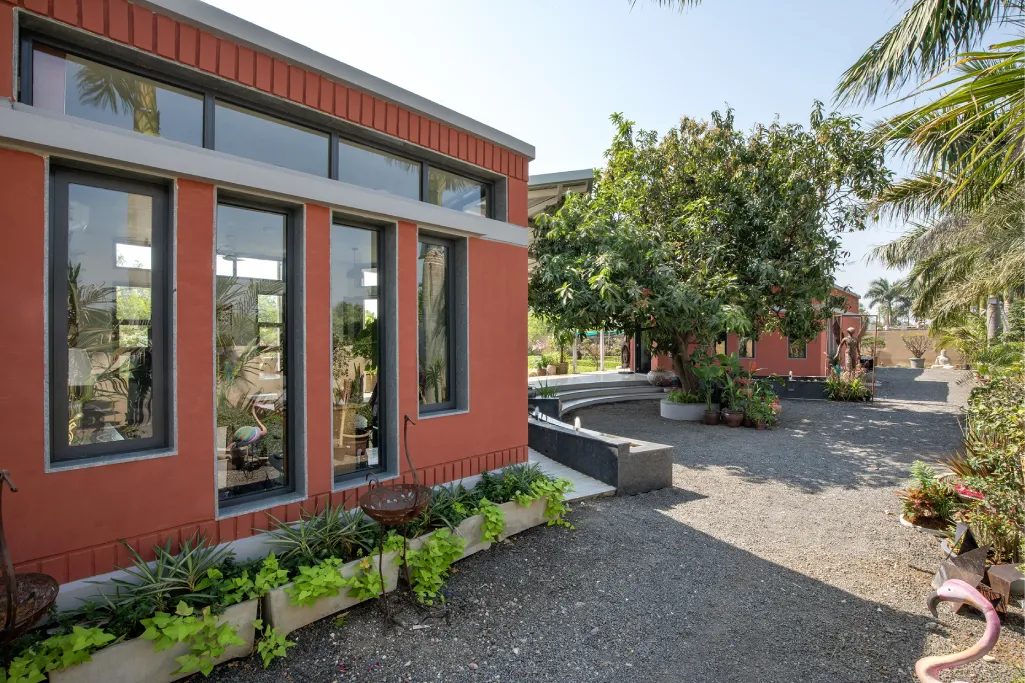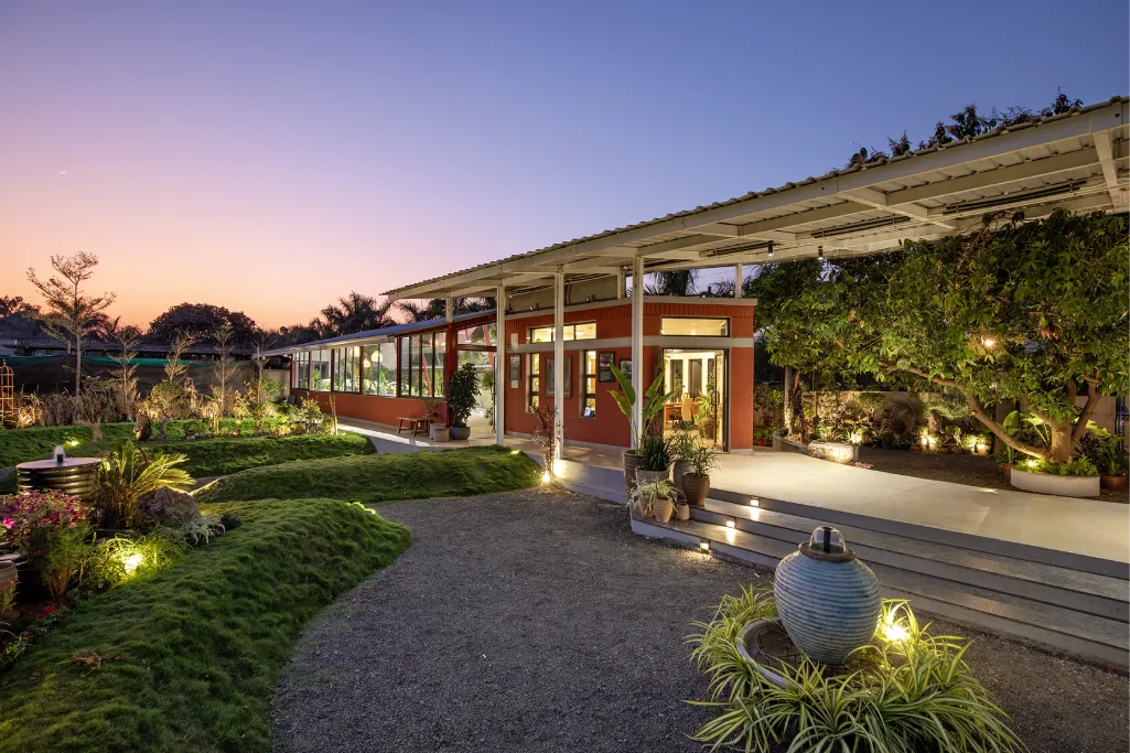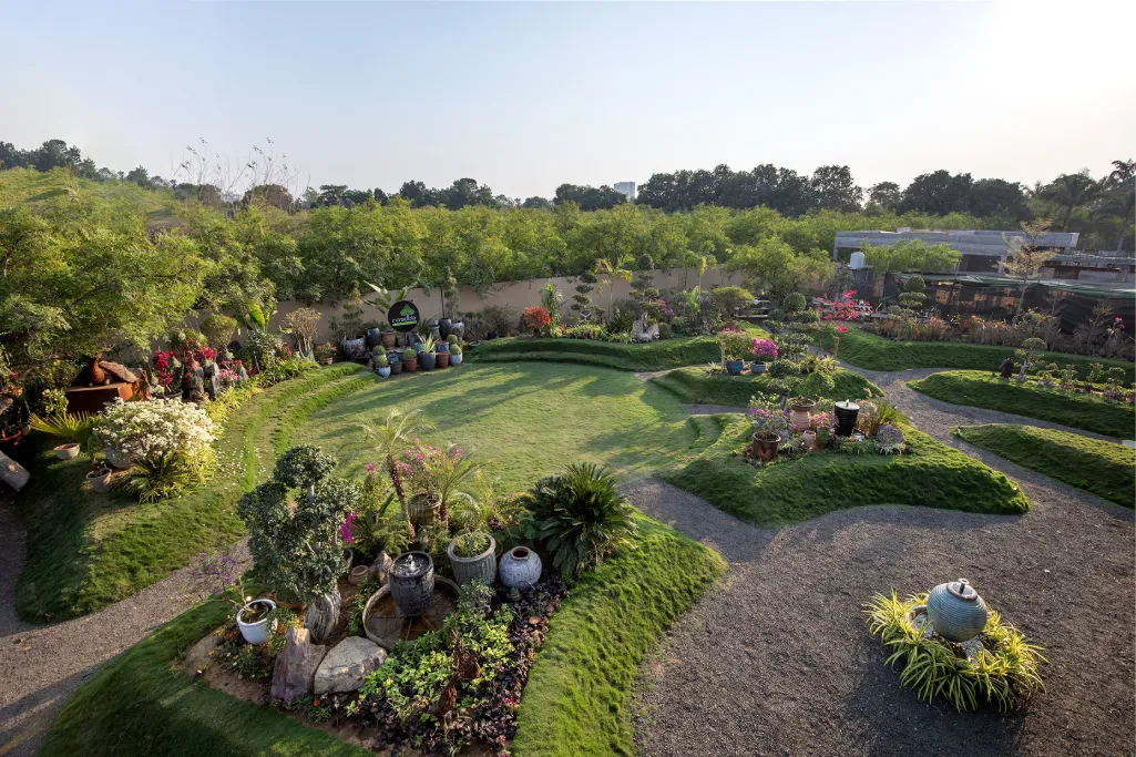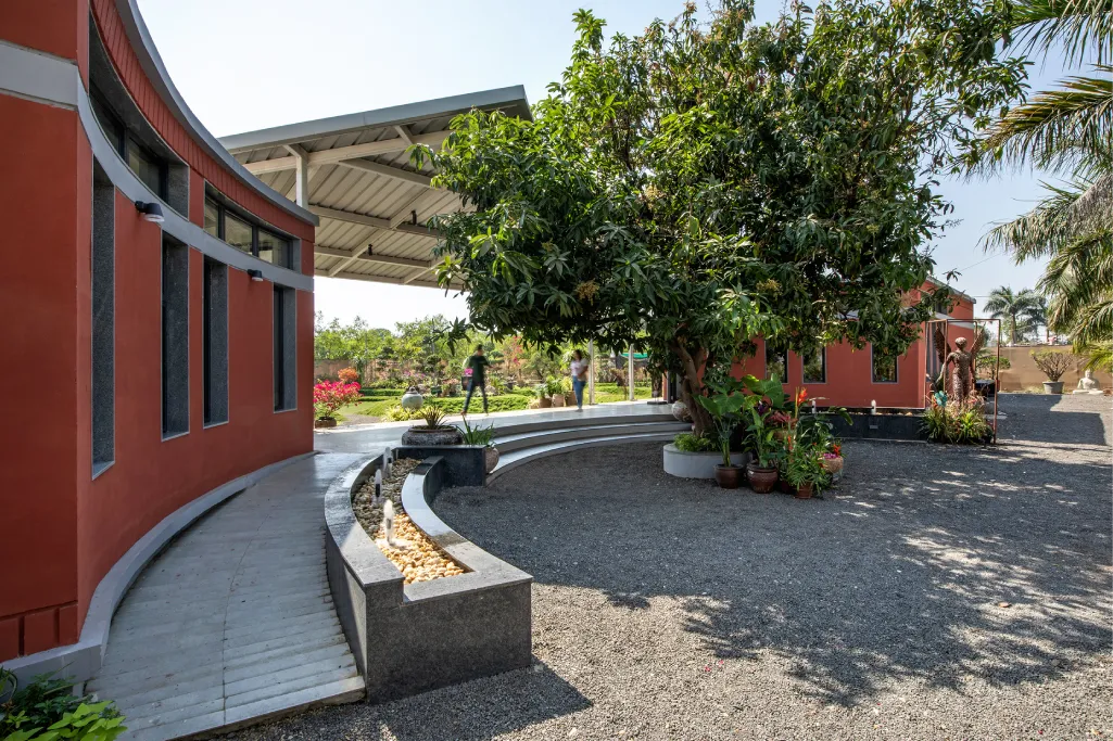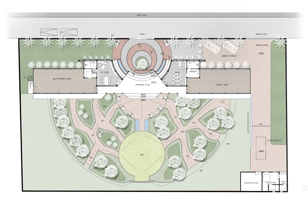 Being a garden experience centre, it was crucial to allow for a free-flowing circulation, with least visual and physical barriers. By thinking of the plan in such a manner, it was important to think of how visitors would move around the site and what the entry and exit sequence would be. Keeping this in mind, the drama of the architecture responds to the site by keeping the existing Mango Tree as a focal point and also the main entry. It is then flanked by 2 curved offices embracing the circular crown of the Mango Tree and 2 light-weight steel fabricated structures housing the indoor displays. The Mango court establishes the centre of the plan and orients one towards the green beyond. The entrance foyer is intentionally kept open to allow for direct views towards the external landscape display beyond the structure without any visual impediment. By doing so, the lines are blurred between indoor and outdoor spaces creating a sense of openness throughout the masterplan. The landscape beyond the entrance foyer threshold reveals itself in its entirety once visitors step up on the 600 mm plinth. The external landscape is cleverly designed to mimic an amphitheatre style display to allow for one to experience all plants and pots on display. Directly connected to the axis of the Mango tree is the large circular open area in the middle of the meandering landscape display. It was intentionally kept open to allow for the client’s requirements to be fulfilled of hosting small and large events like learning how to create ones own curated potted plants, baby-showers, dinners, music events and conferences.