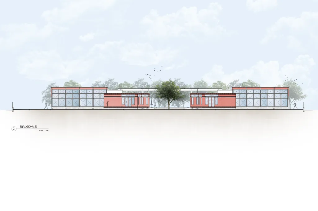 An important aspect of the project also rests in the indoor display areas along with the administrative offices. The steel structure of the 2 main displays is finished in an attractive red paint resulting in a dominating presence facing the main road. These structures have an exaggerated slope from 8’-0” on the South elevation to 14’-0” on the North Elevation. These spaces were thought of as a glass house but with proper insultation under the roof. It is important to note that the requirement was to have non-airconditioned spaces and the above strategy allows one to do so as the lowest side draws in natural air and releases it towards the North. In addition, as the larger glazing faces North, an abundance of soft-natural light completely fills the interior mitigating the use of artificial light and hence further reducing energy consumption.
