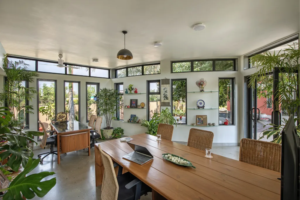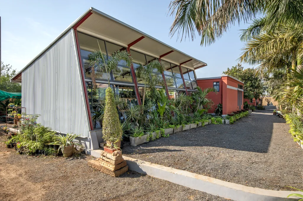 As for the 2 offices, Managing Directors and the administration, are equipped to accommodate 10 staff members with a conference room, toilets and a pantry. It is strategically located at the entrance so as to keep a keen eye on the visitors coming in. The curved shape of the entrance steps flows right across the walls making it curved creating an interesting volume for the interior of the offices. Being offices, privacy mattered and hence the openings are restrictive and minimal. In addition to the typical window openings, we have introduced clerestory windows as well enhancing the indoor natural light quality that is glare free to allow the people residing within to work comfortably. In addition to the display units and the offices, supporting spaces for growing and storing of plants was provided directly connected to the service road