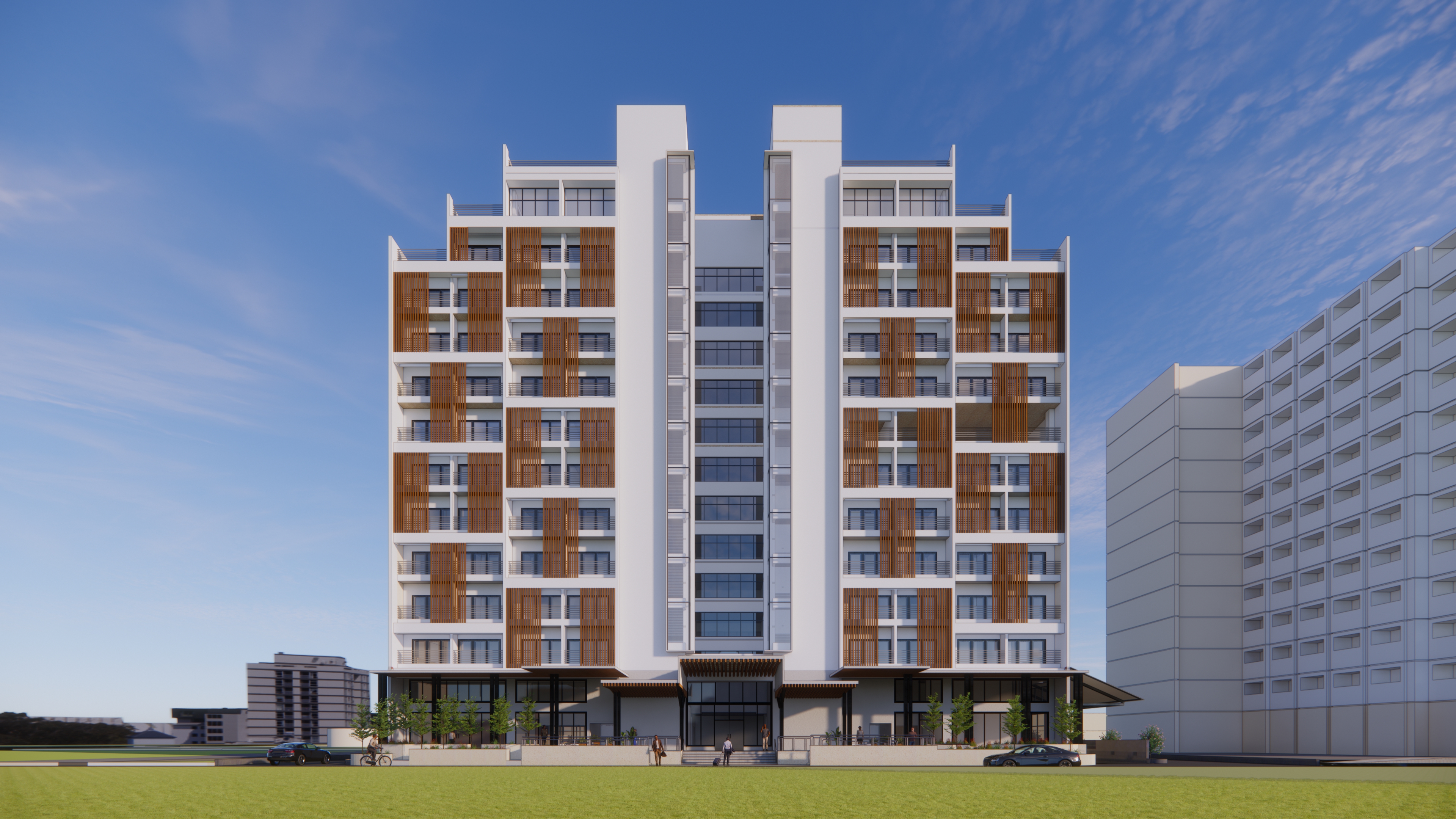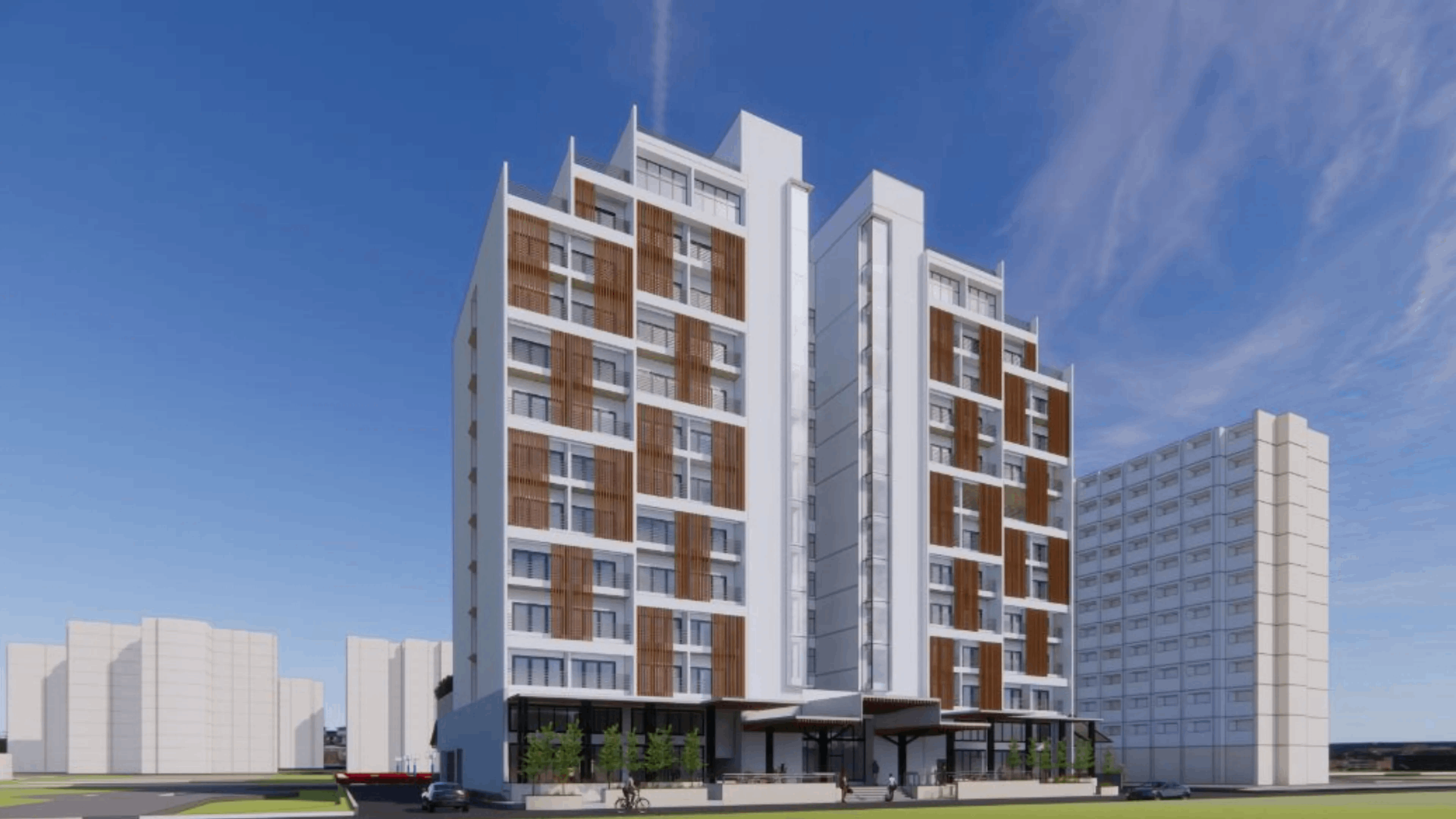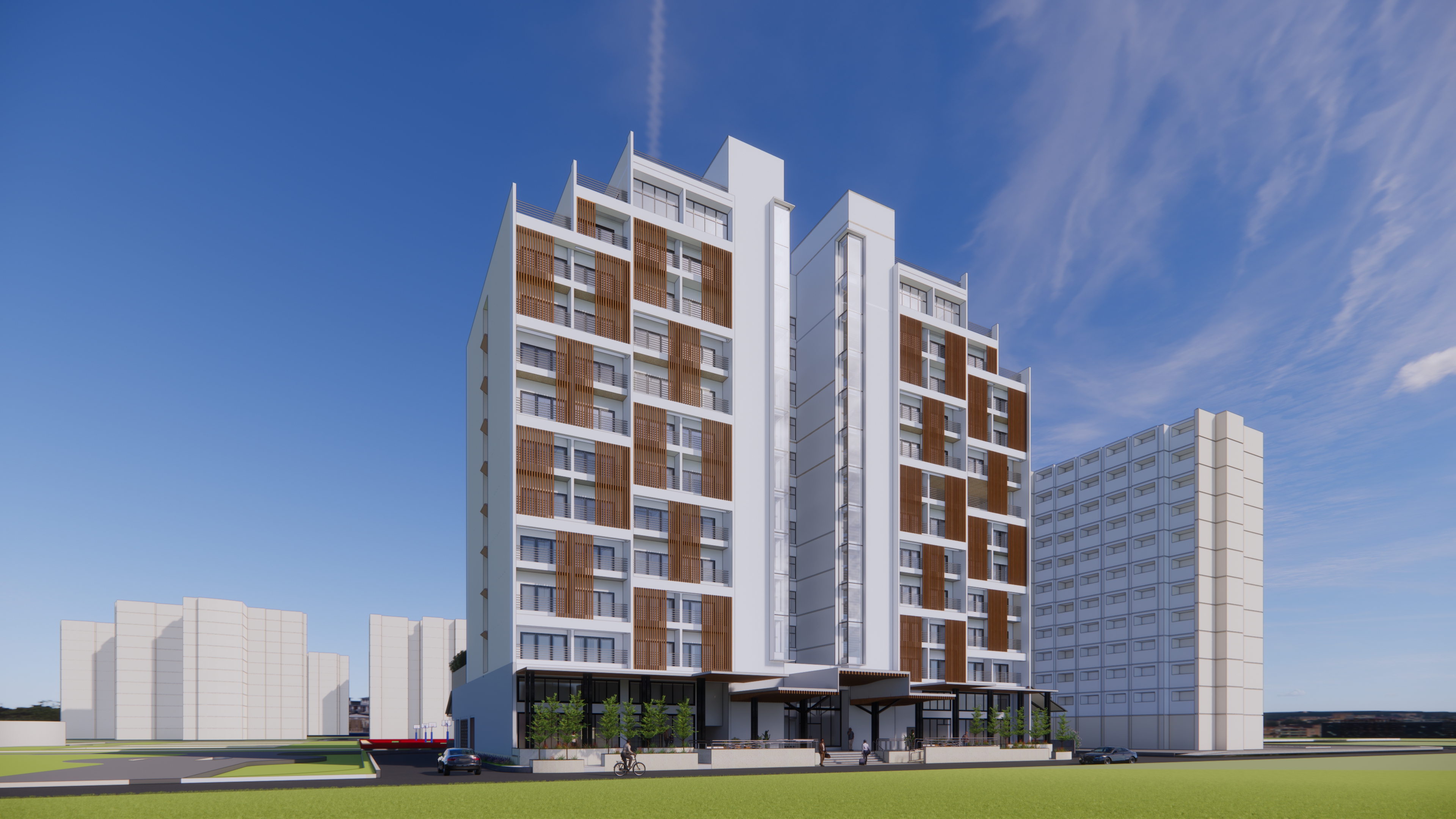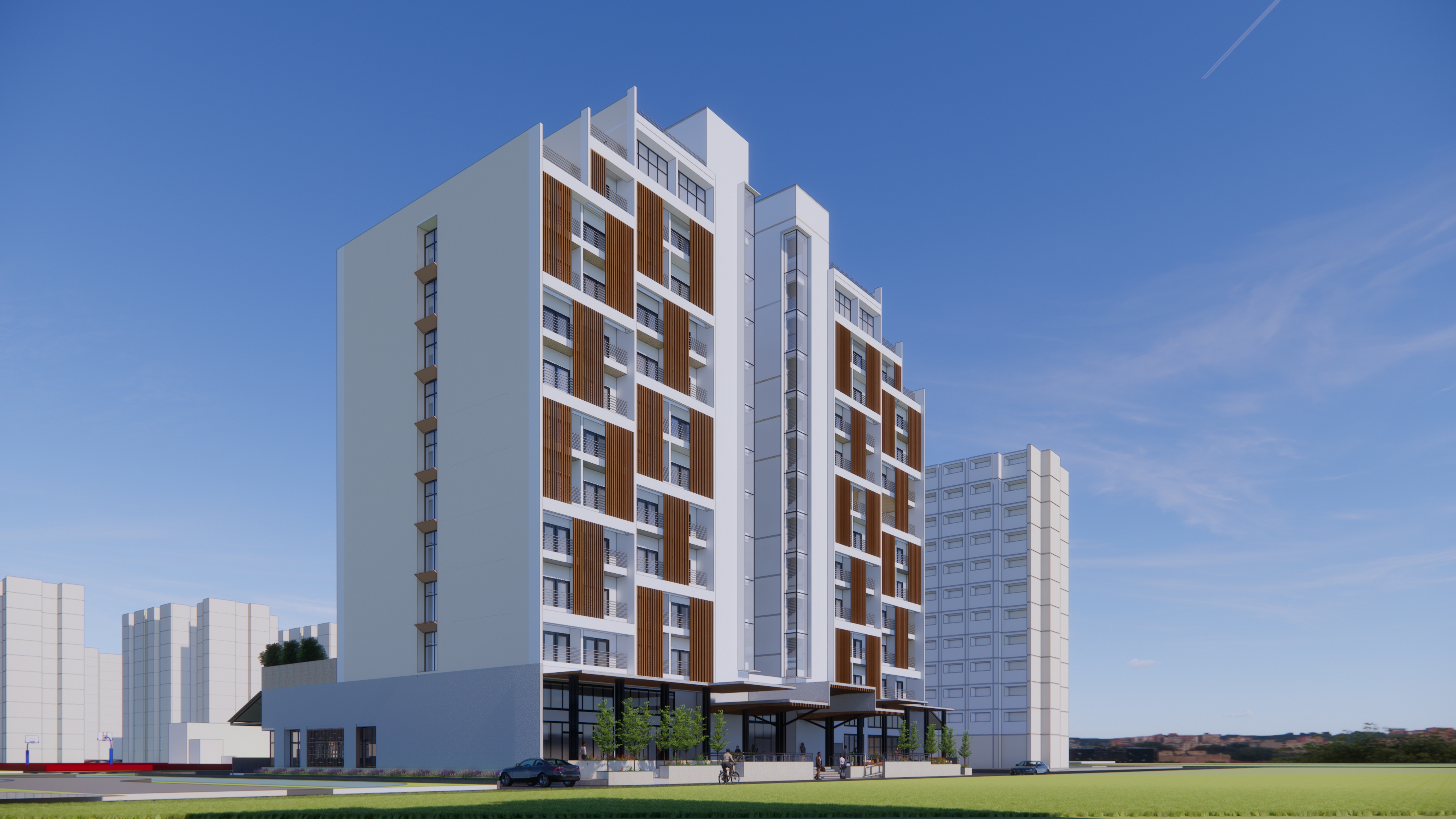 Internally, the vertical core is placed at the center of the building with a combination of double and single loaded corridors for efficient planning. As an evident feature, balconies have been included in all rooms with the option of using the space to dry ones clothes but also to enjoy the outdoors. In order to block the vision but still allow light and air to help dry the clothes and also to ventilate the rooms, vertical louvers have been included.
