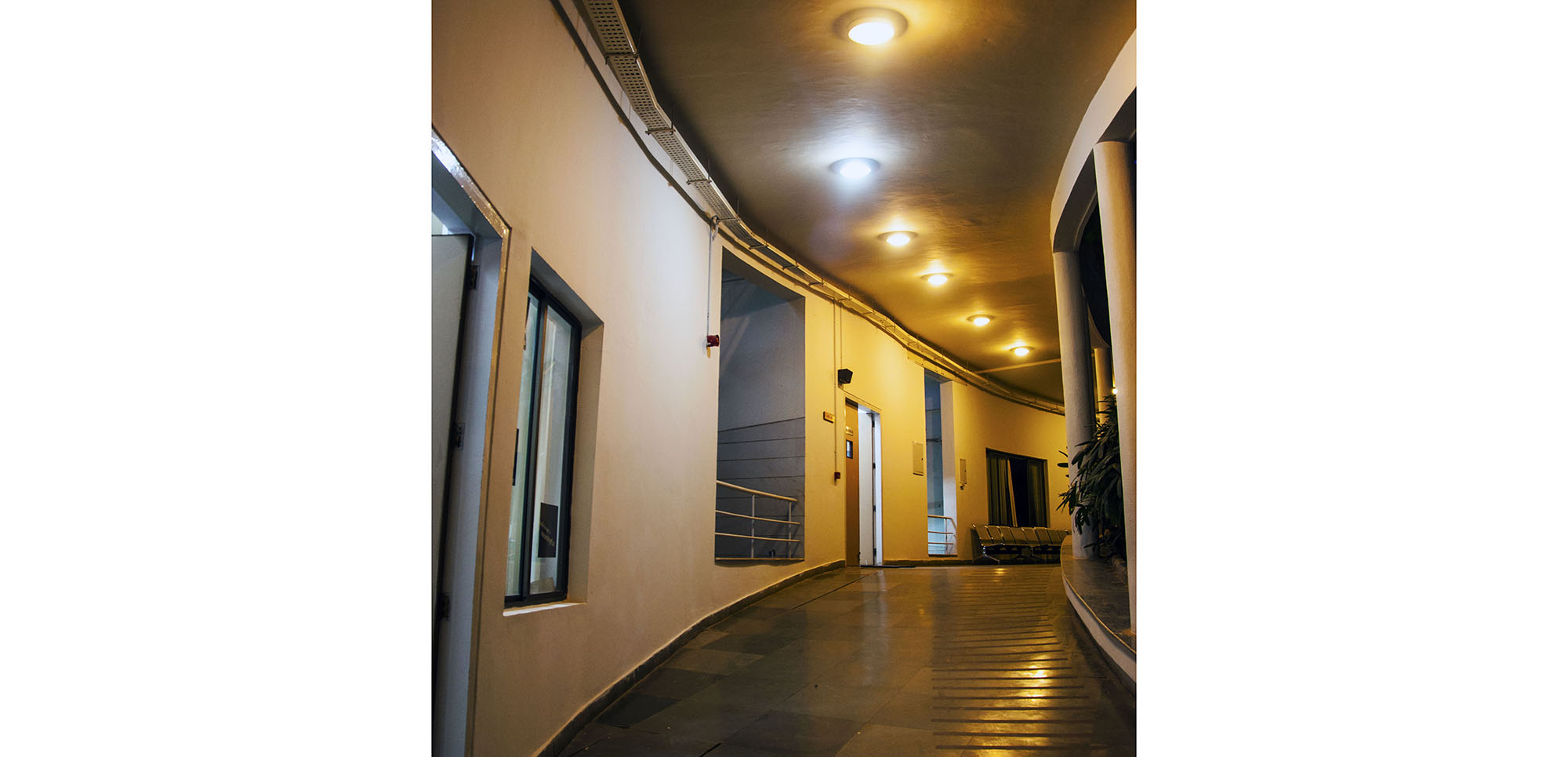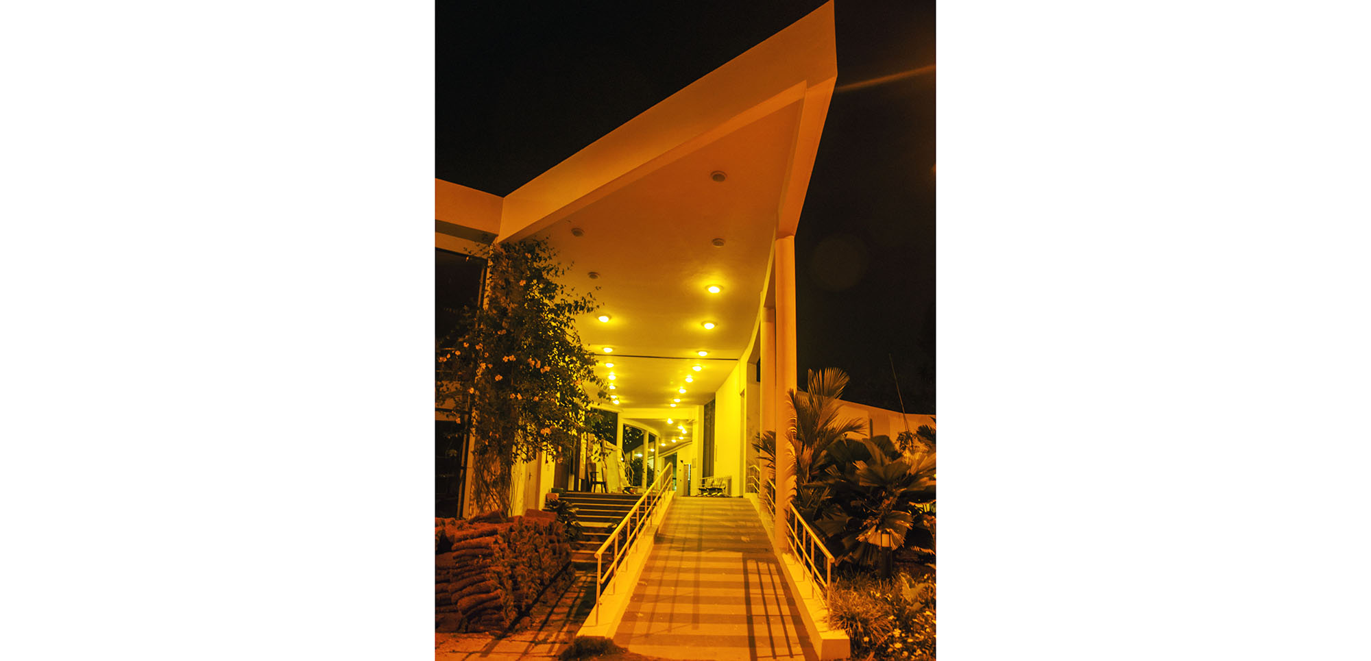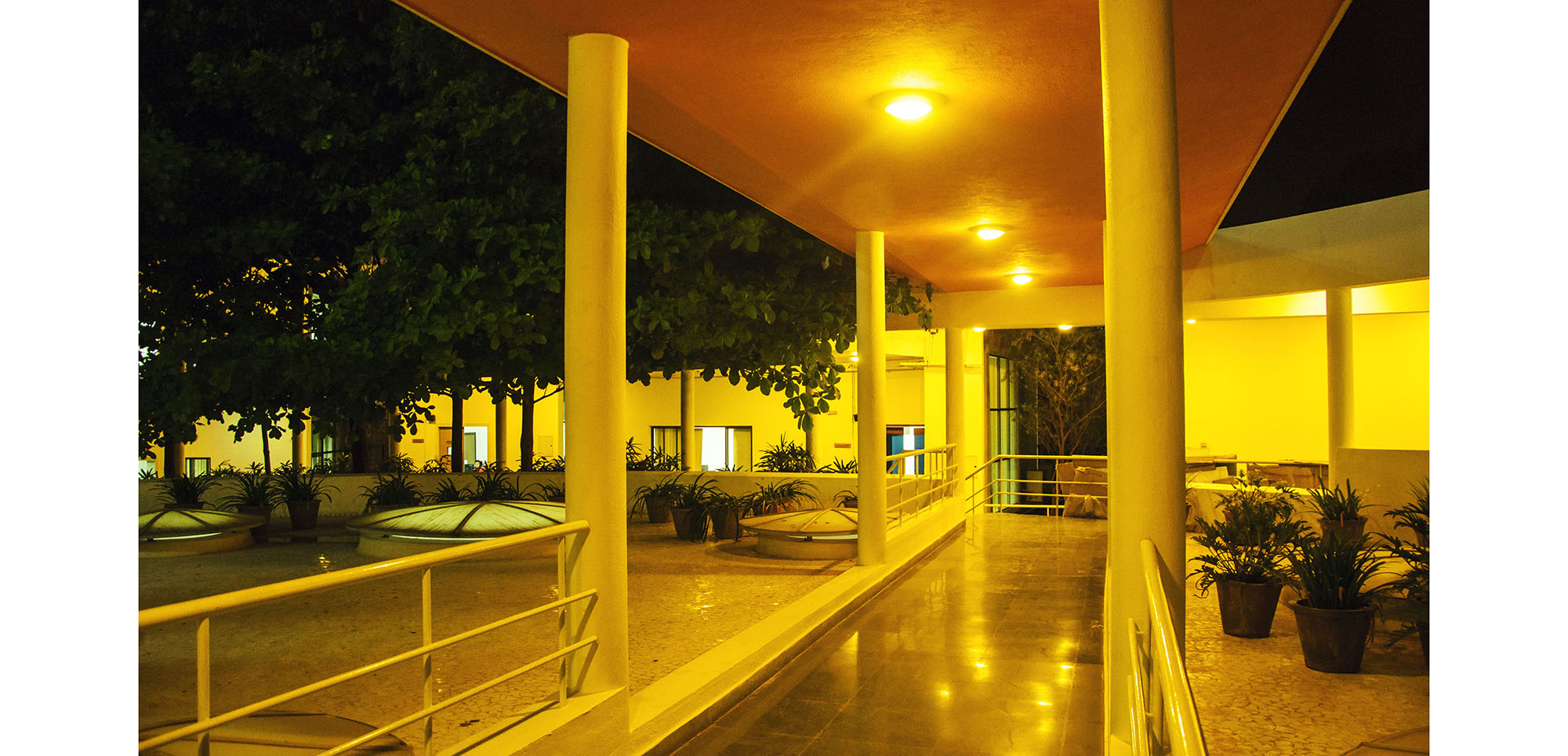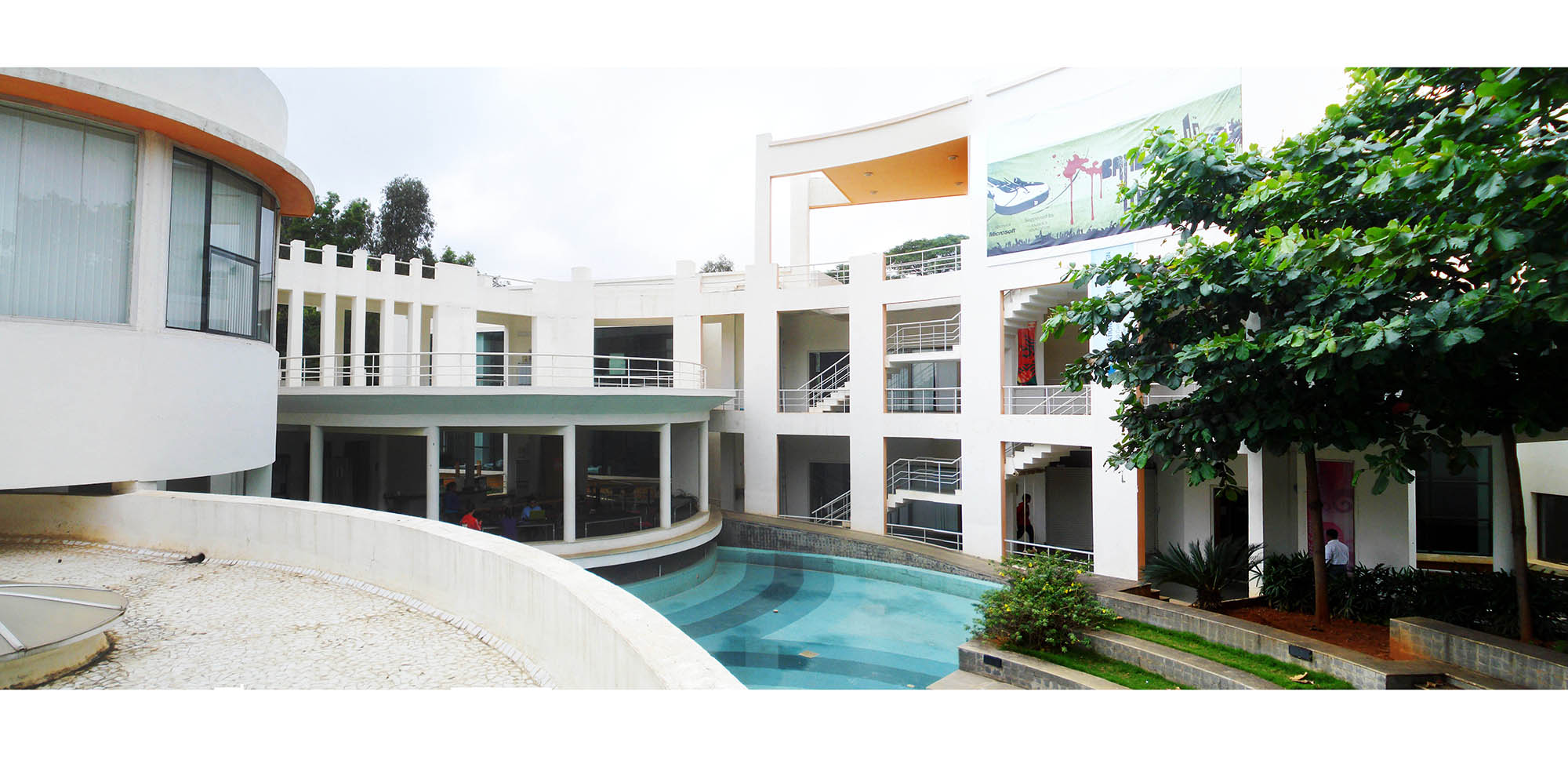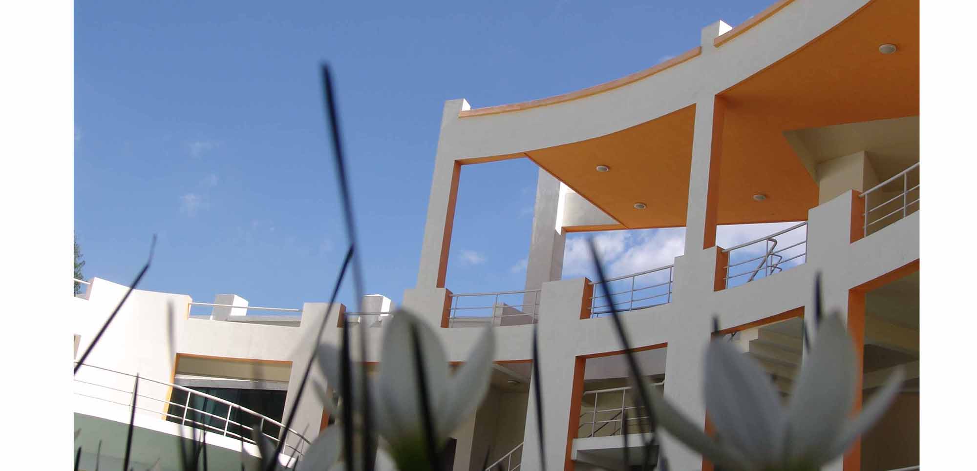 The guest house, meeting facilities and cafeteria are on the other side of the central open space. The two rear blocks are planned to grow vertically in case of future expansion.