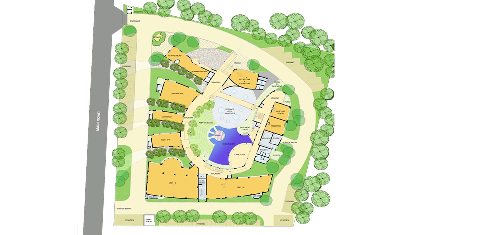 At the heart will be a ‘Forum’ – A central amphitheatre and water body, which will become the stimulating center connector - the interface between the public exposition spaces and the privacy of the academy.