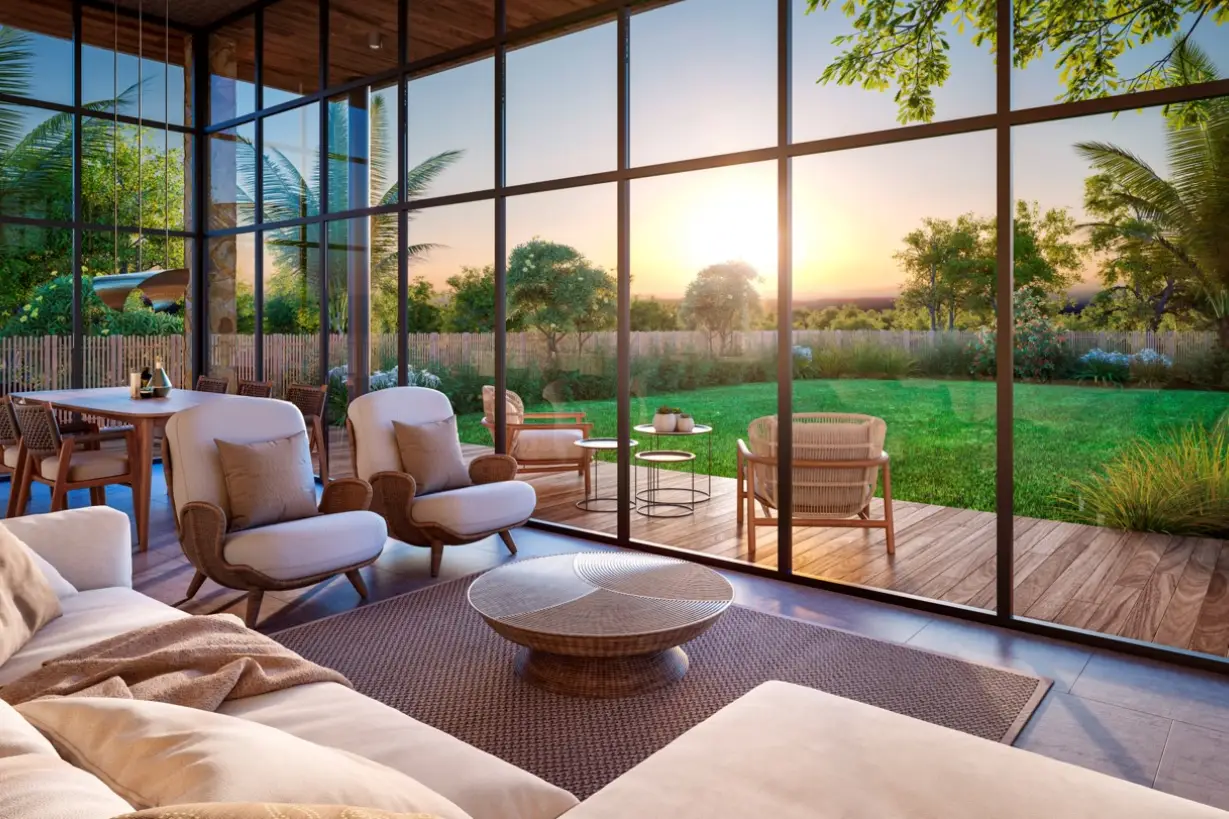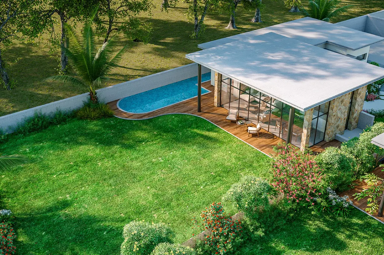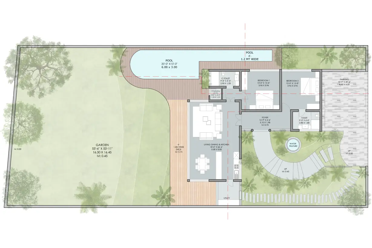 The architecture comprises a compact footprint with a double-height modern living and dining space overlooking the vast private garden of 4,500 sq. ft.